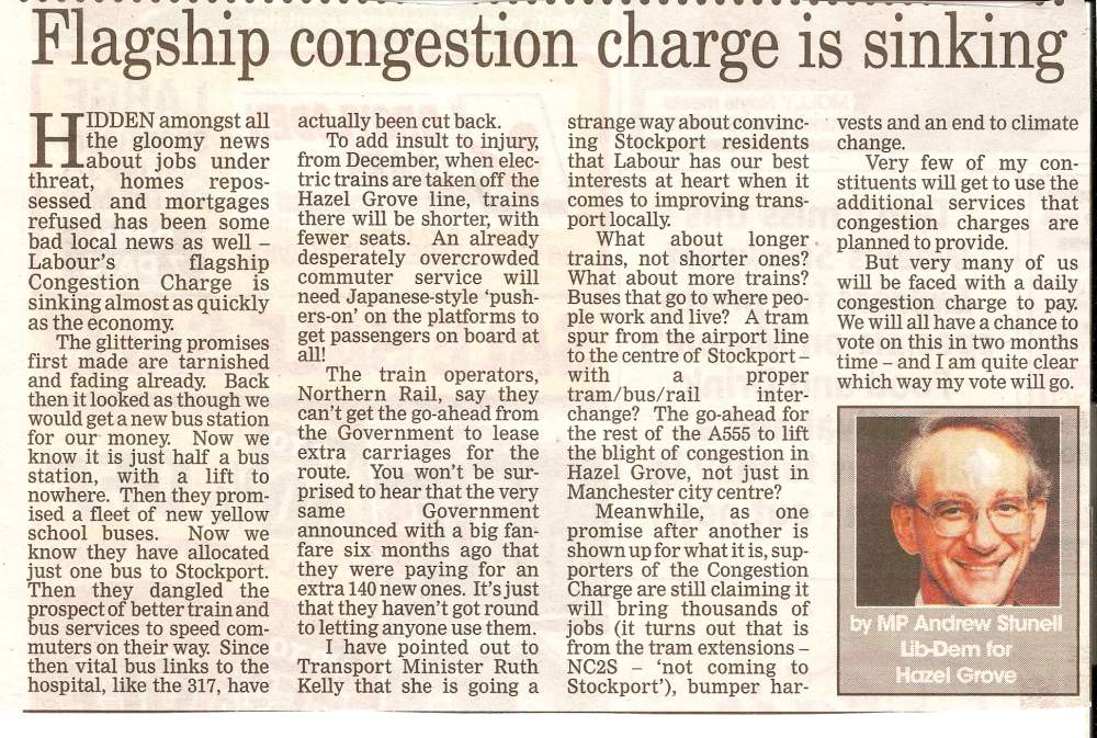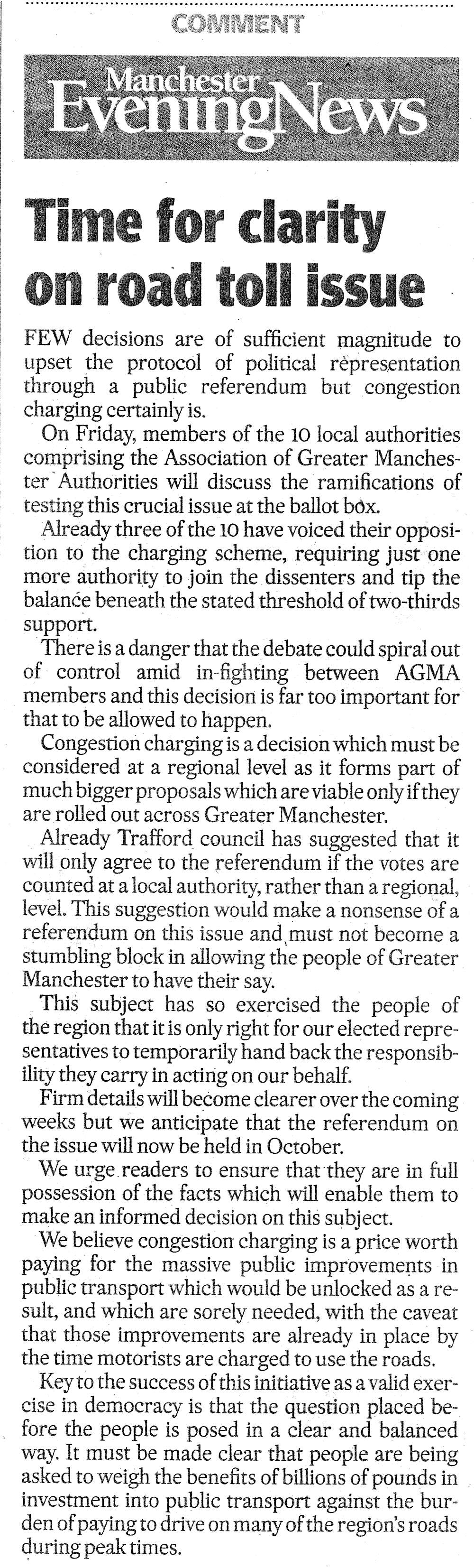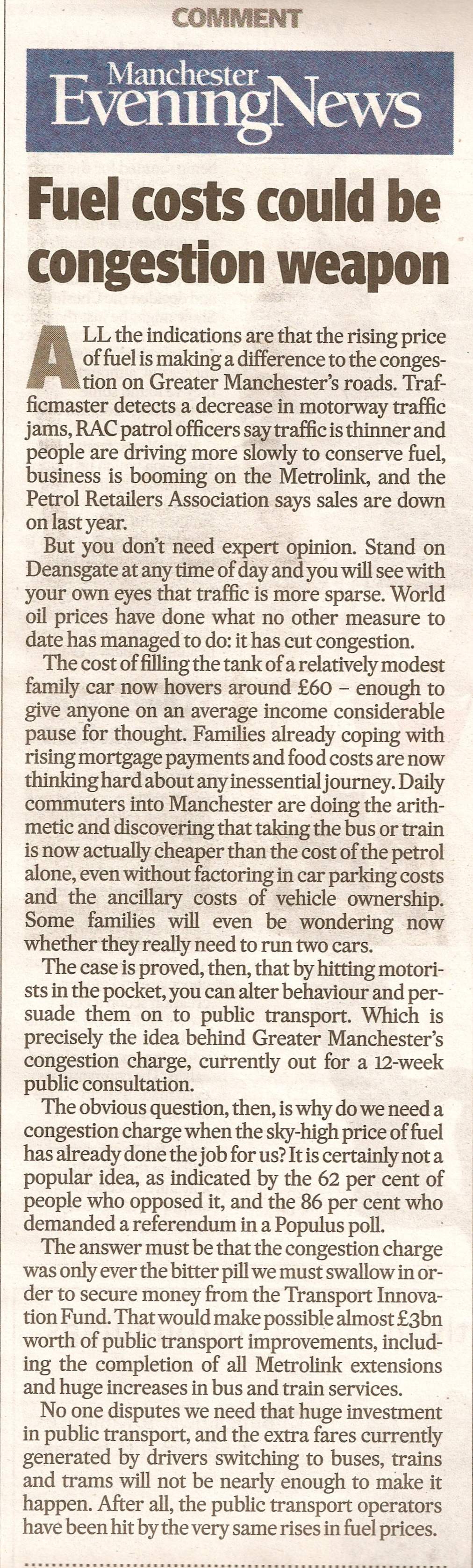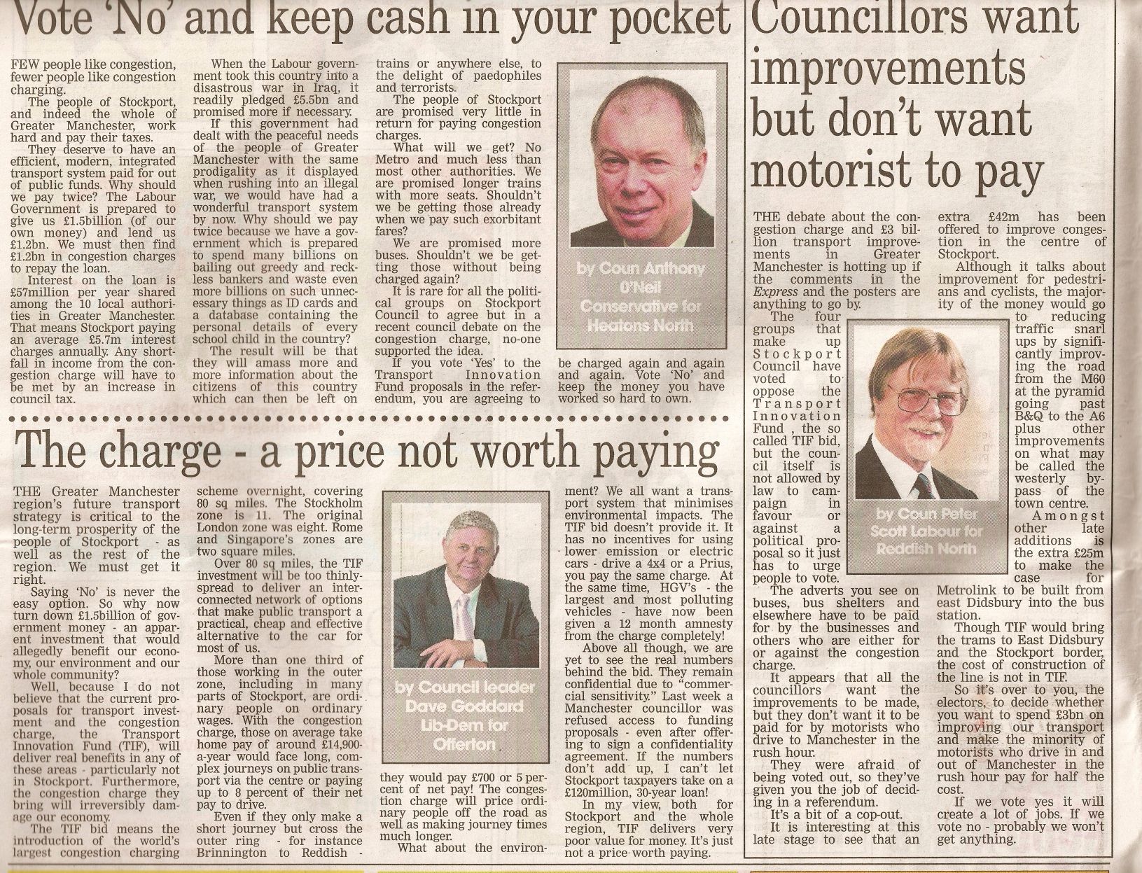 ![]() (Salford Advertiser) | In most of Greater Manchester the toll supporters denied thrice that they were, which made it confusing for voters. It also means that the net gain for each party does not mean much as in many of the districts not only were there false claims from Labour and Lib Dems that they opposed the tolls, there were also many Labour and Lib Dem candidates who genuinely opposed the tolls. But there was one ward where the issue was clear cut and that was Irlam in Salford where the Transport boss who is the figurehead for the tolls plan was standing. He went from first place to third - Salford Advertiser - "Shocks in Salford as Jones is out" Manchester Evening News - "Transport boss loses seat" MEN - "Setbacks for Labour in Salford" Crain's - "Leading pro-congestion charge campaigner drubbed at the polls" |