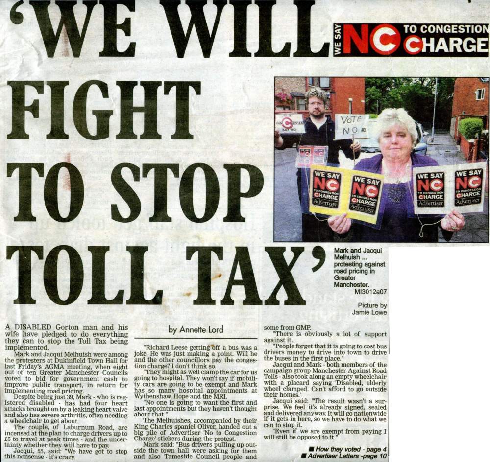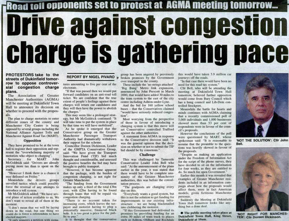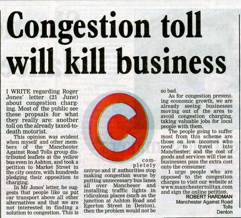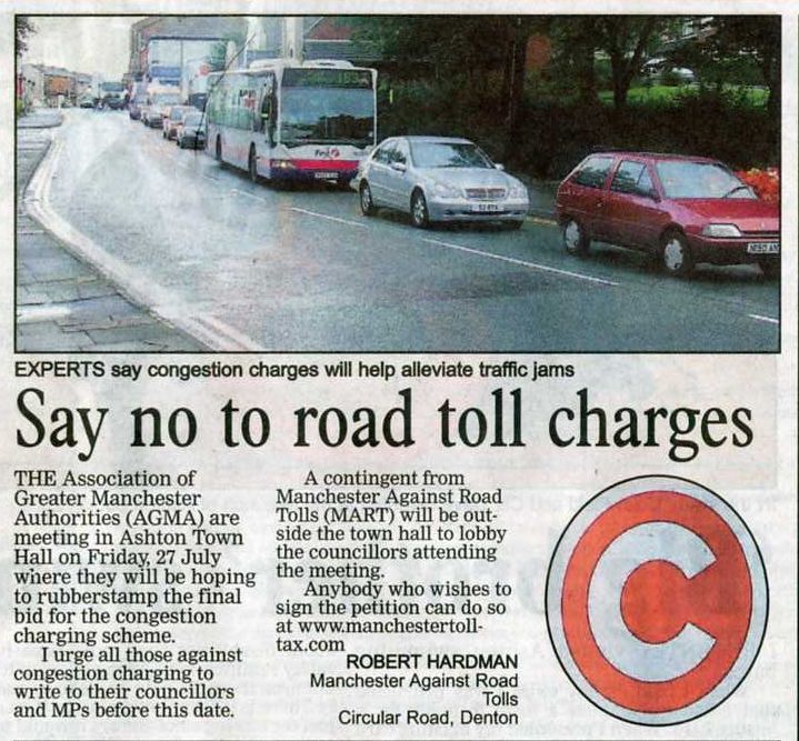 ![]() | MART spokesman, Sean Corker, said - "This so called "congestion charging" is really a toll tax which will turn business and cash away from the city. It will also damage individual freedom as collection and enforcement of the charges will rely on cameras." "Driving a car is often an essential part of our lives, yet the aim of these charges is to force the poorest off the road. There has been a massive campaign at taxpayers expense to try and sell this regressive tax. MART exists to give a voice to ordinary people and to counter the misleading propaganda.". |