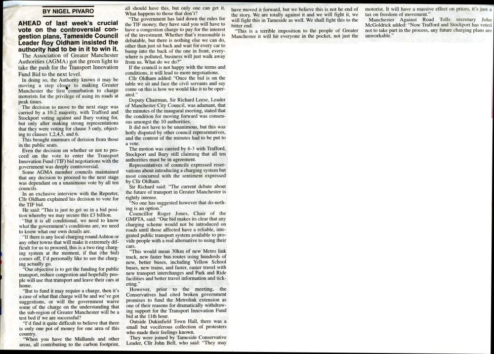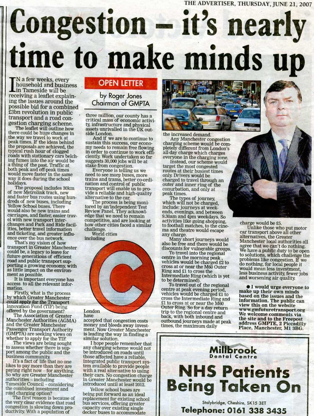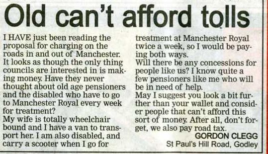 ![]() | Today the opposition against the plans for road charges in Greater Manchester kicked into a higher gear. Part of this was a press conference organised by Sean and Neil, to launch a new epetition against the tolls. The event got great coverage on TV and radio and was the number one item on regional news. Let us see what coverage it gets in the M.E.N! There were various speakers including Peter Roberts (who started the 1.8 million petition against road pricing) he said - "Now is the time for the people of Manchester to start the fight back against these toll plans which will destroy jobs and put the city at a major economic disadvantage. Transport planners have hatched a scheme to isolate Manchester with a version of the Berlin Wall, an electronic barrier called the M60 motorway — an astonishing own goal for a great city.Politicians are denying the people of Manchester a voice on this crucial issue and Manchester Against Road Tolls (MART) is determined to give them their say." Report on Channel Four - "Congestion charge petition online". Granada News report. |