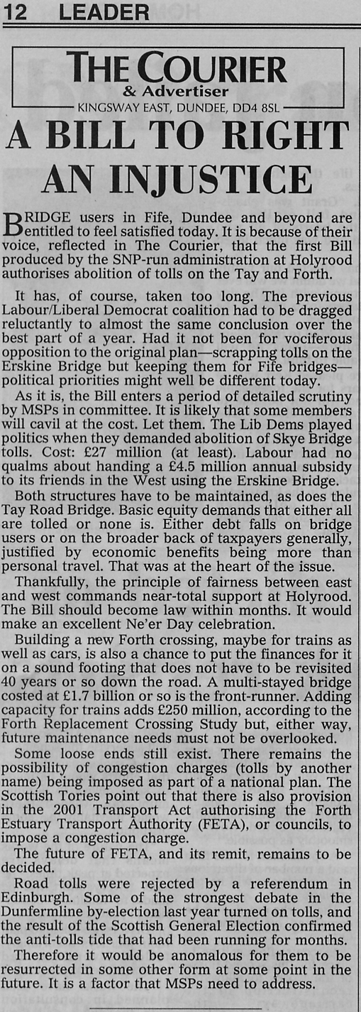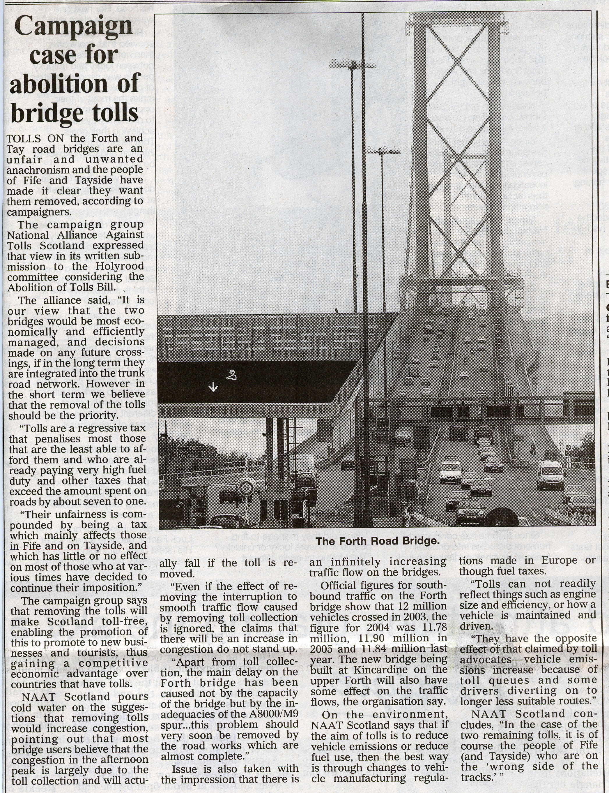 - From other papers, including the Scotsman group who campaigned to keep the tolls and must now be hoping that the Forth bridge authority manages to engineer continuing congestion to keep the barbarians out - Evening News - "'How do they plan to pay for a new bridge?'" Daily Record - "Motorists Take Advantage Of Toll-Free Bridges" Scotsman - "Roadworks put brakes on drivers' first toll-free crossing of bridge" Herald - "Traffic flows as last bridge tolls in Scotland scrapped" Scotsman Opinion - "No tolls - and we're paying for it" Arbroath Herald - "Toll-free traffic flows freely".