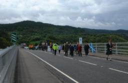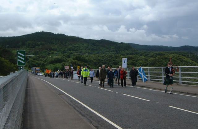 At 12 p.m., just under 100 people, led by local MSP John Farquhar-Munro and accompanied by SKAT members, supporters and well-wishers from across the country, left from Kyleakin to walk across the Skye Bridge to continue the almost TEN years of protests against the high tolls