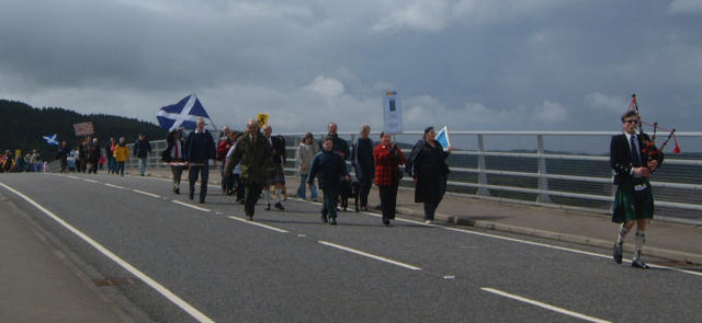 The protestors were accompanied by local police who did a good job of allowing bridge traffic to continue to flow while the marchers walked across the bridge accompanied by a piper.